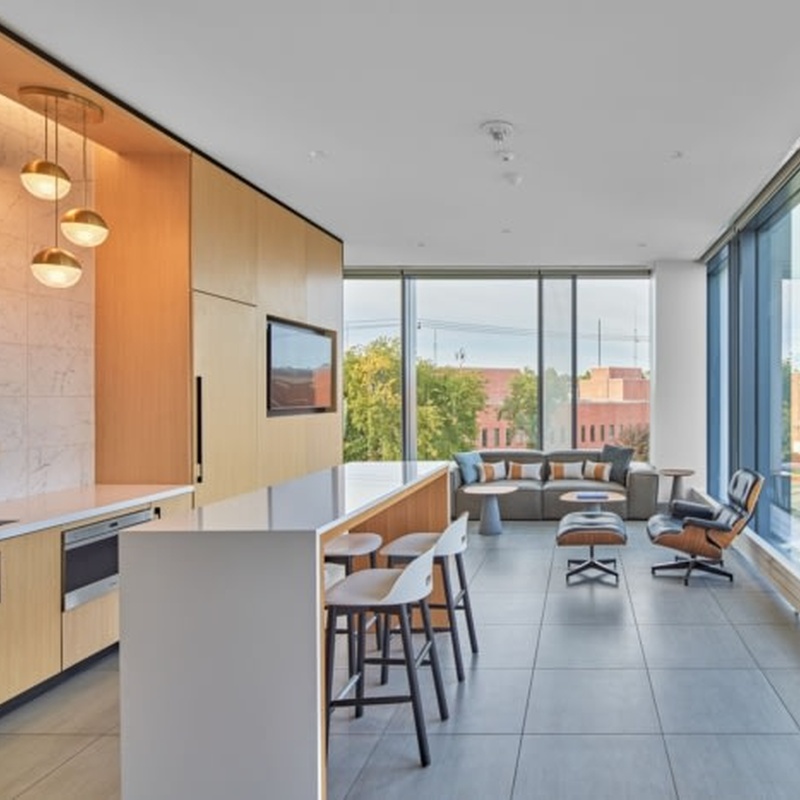 - Fully custom millwork package throughout the facility, including reception desk, workstations, collaboration areas, kitchen, and built-ins